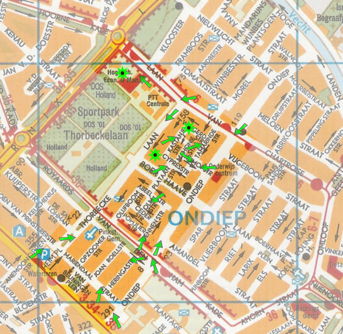 De groene pijlen en sterren op deze kaart zijn links naar afbeeldingen. Als u erop klikt, wordt de foto getoond.